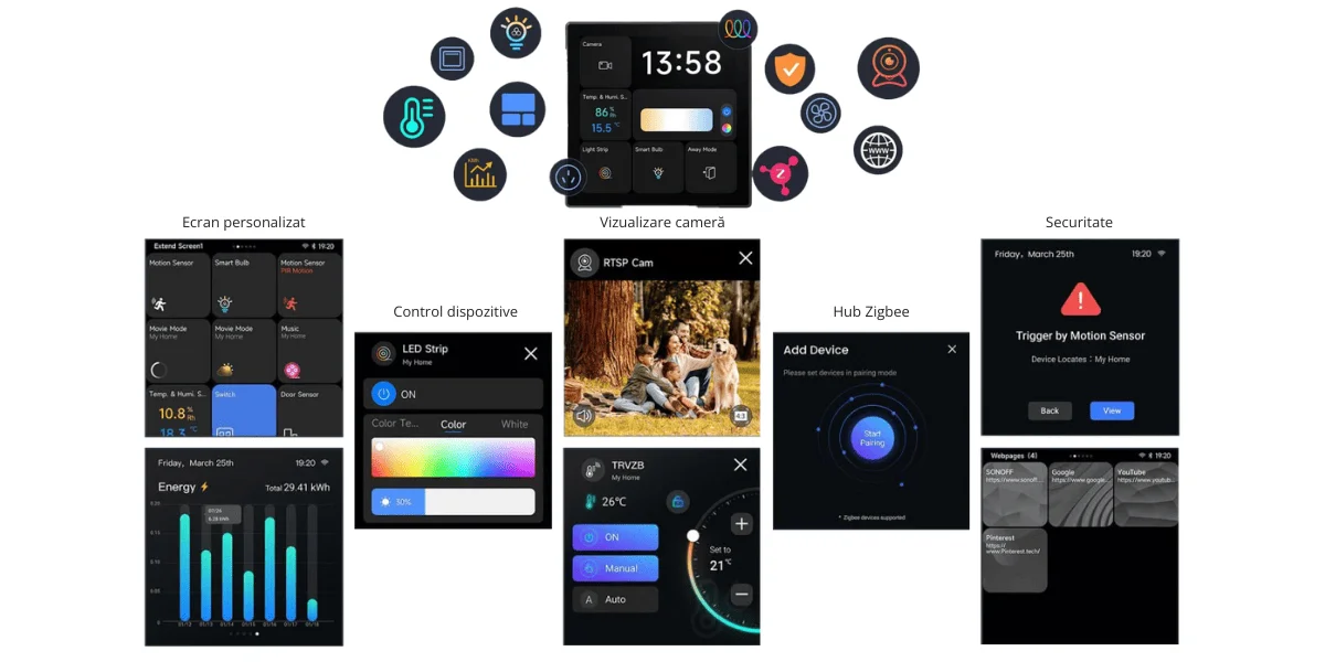 - NSPanel Pro poate acționa ca un hub Zigbee, integrând dispozitive de la diferiți producători (de exemplu Aqara, Philips Hue). De asemenea, suportă modul router, util pentru case cu mai multe etaje.