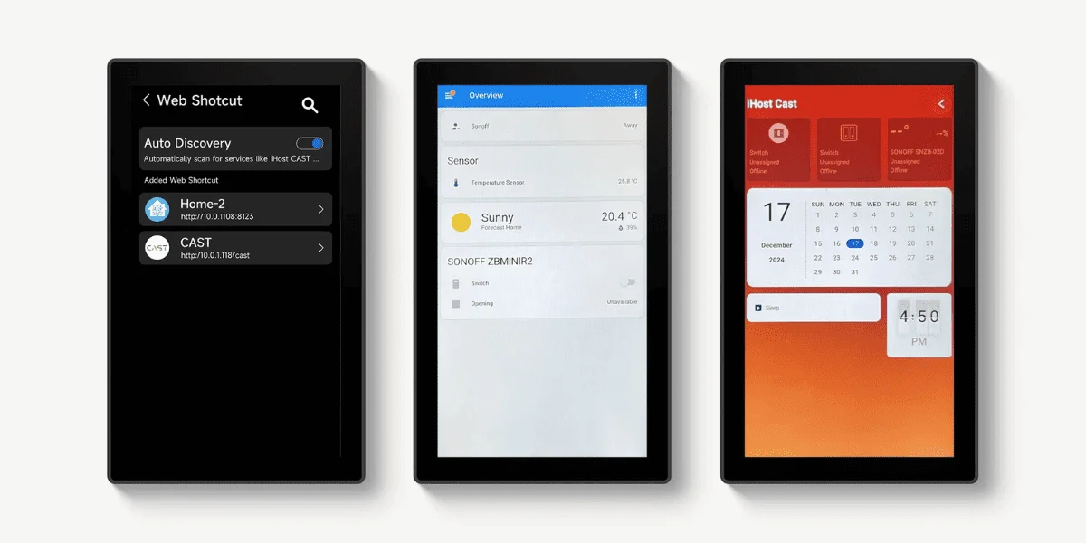 - Web-shortcuturi: acces rapid la servicii locale (de exemplu, panouri HA sau iHost) cu păstrarea sesiunii.