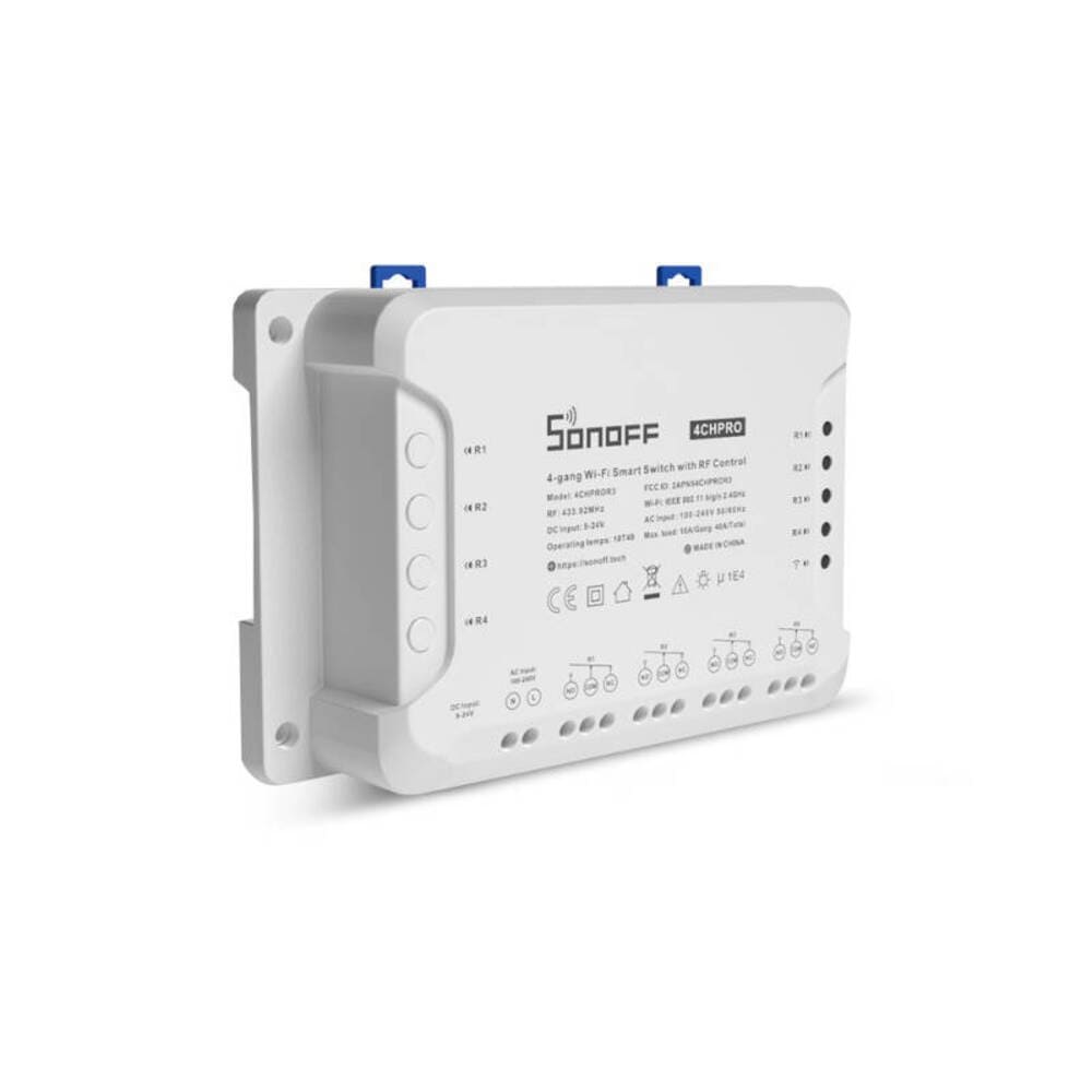 Sonoff 4-канальное Wi-Fi и RF реле (145×90×34 мм, 228 г): управляет 4 устройствами, ток до 10A на канал (16A суммарно). Подключение через Wi-Fi 2.4GHz и радиоканал 433,92 МГц. Чип ESP8285. Поддерживает три режима: импульсный, фиксированный и переключатель. Подходит для установки на DIN-рейку. Работает при температуре от -10°C до +40°C и влажности 5%–95%. Совместимо с Android/iOS через приложение eWeLink. Поддерживает голосовое управление через Яндекс Алису, Amazon Alexa и Google Assistant. Гарантия 2 года.