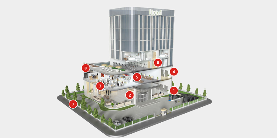 Soluția noastră pentru hoteluri integrează sisteme de supraveghere video, sisteme de alarmare, afișaje video atractive și o platformă unificată pentru a îmbunătăți managementul și securitatea hotelurilor. Siguranța, confortul și eficiența se îmbină armonios în această soluție.